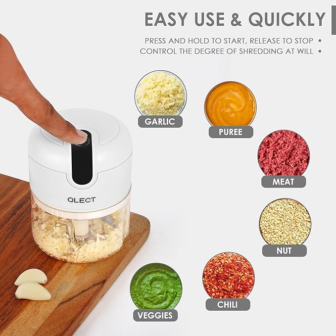 The chopper is made from food-grade materials and features 304 stainless steel blades for safe and healthy food preparation.