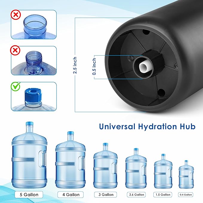 Versatile Compatibility: Fits various gallon-sized containers and offers hot and cold water dispensing, perfect for home, office, and travel use.