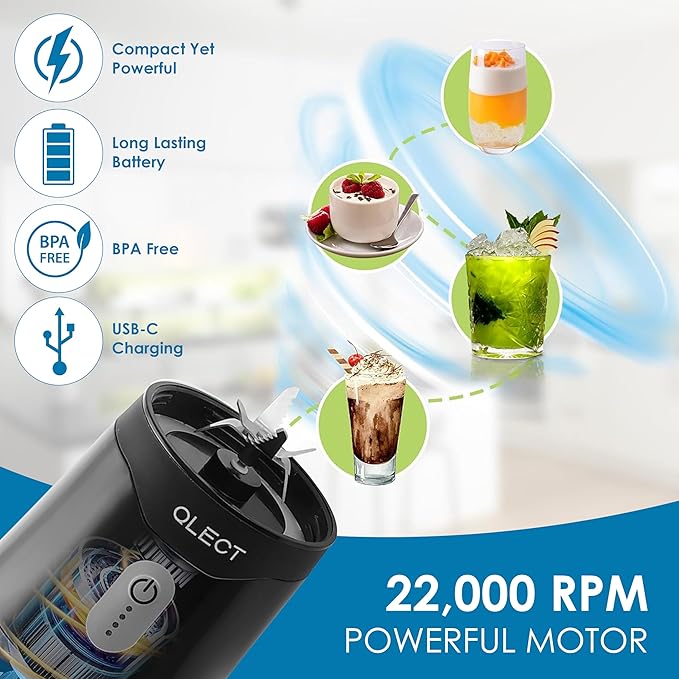 The QLECT Portable Blender features a 4000 mAh rechargeable battery, which provides enough power for multiple uses before needing a recharge.